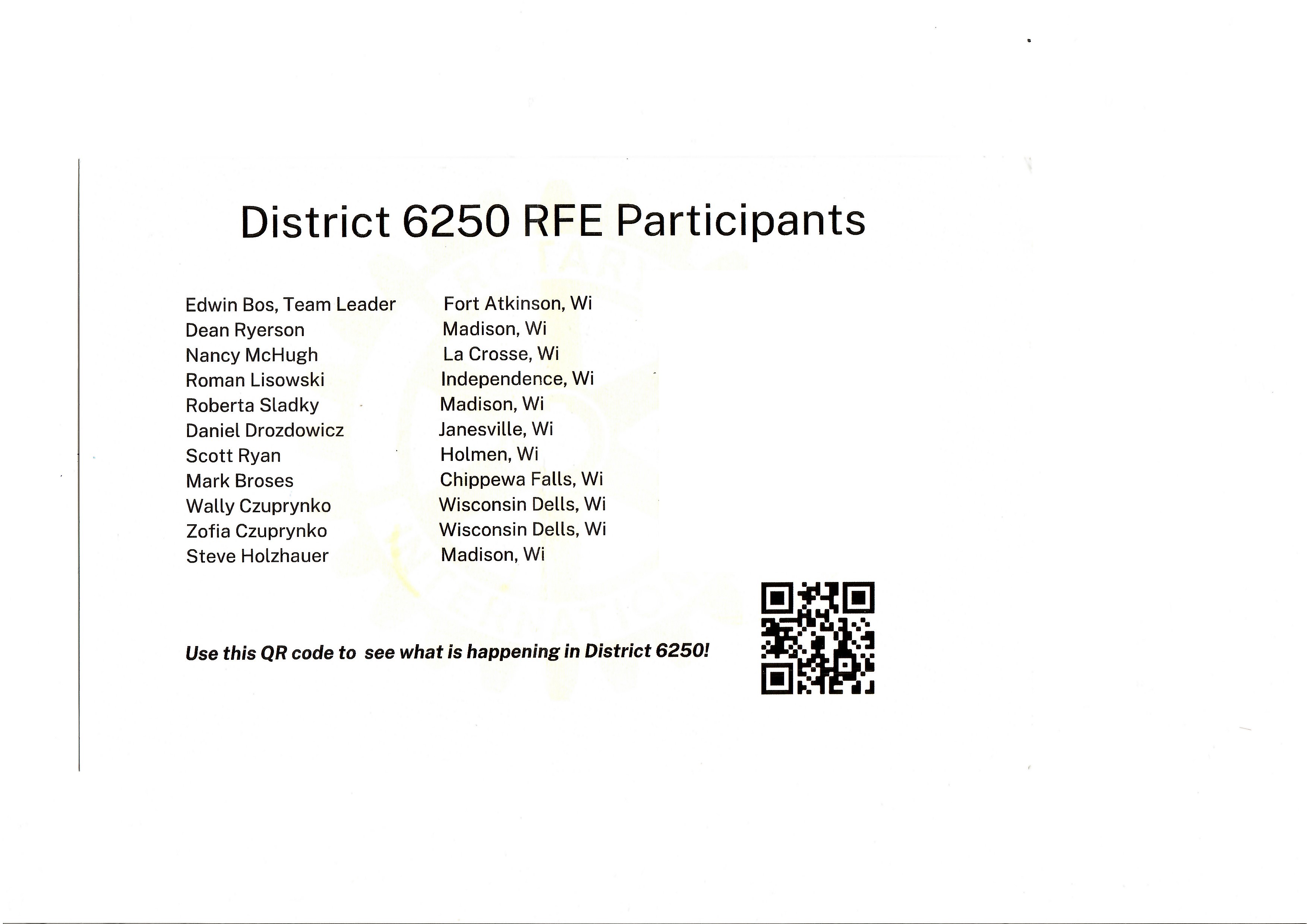Ostatnio gościliśmy w ramach Rotary Friendship Exchange grupę Rotarian z Dystryktu 6250 - Wisconsin USA. Znajomość ta zaczęła się od współpracy naszych klubów w ramach pomocy uchodźcom wojennym z Ukrainy. Rotarianie z Wisconsin zasilili nasz fundusz pomocy Ukrainie pokaźną kwotą, za co jesteśmy im bardzo wdzięczni. Nic dziwnego zatem, że w trakcie ich wizyty w Szczecinie wspólnie odwiedziliśmy też naszych podopiecznych z Ukrainy. W załączniku lista wizytujących nas Rotarian z Wisconsin i ich zdjęcie w trakcie zwiedzania Szczecina.