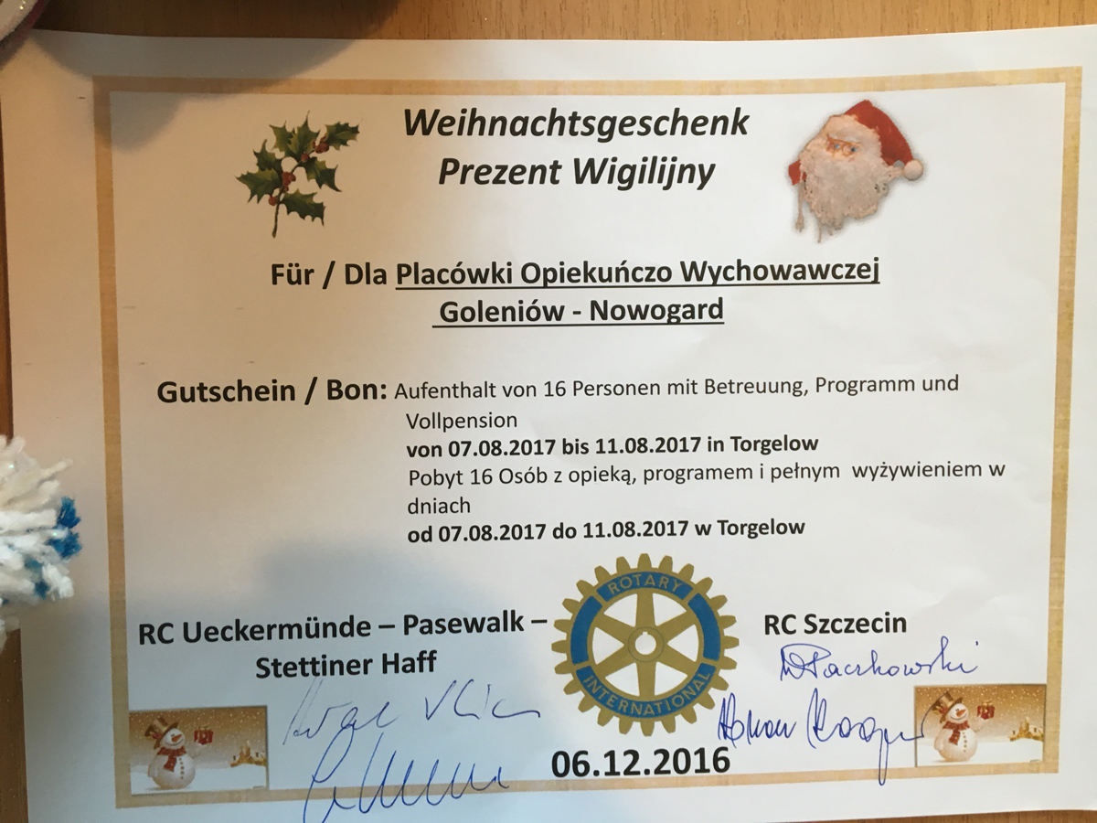 W tym roku, jak zawsze zresztą, przekazano odzież dla dzieci i młodzieży, wszelkiego rodzaju łakocie: owoce, cukierki, czekolady itp., których współfundatorami oprócz naszych klubów Rotary, były także władze samorządowe powiatu i gminy. Była też niespodzianka ufundowana wspólnie przez nasze kluby. W trakcie spotkania mikołajkowego przekazaliśmy vouchery na tygodniowy wypoczynek z pełnym wyżywieniem i atrakcyjnym programem pobytu w okresie wakacyjnym dla 16 dzieci wraz z opiekunami w ośrodku młodzieżowym w Torgelow.