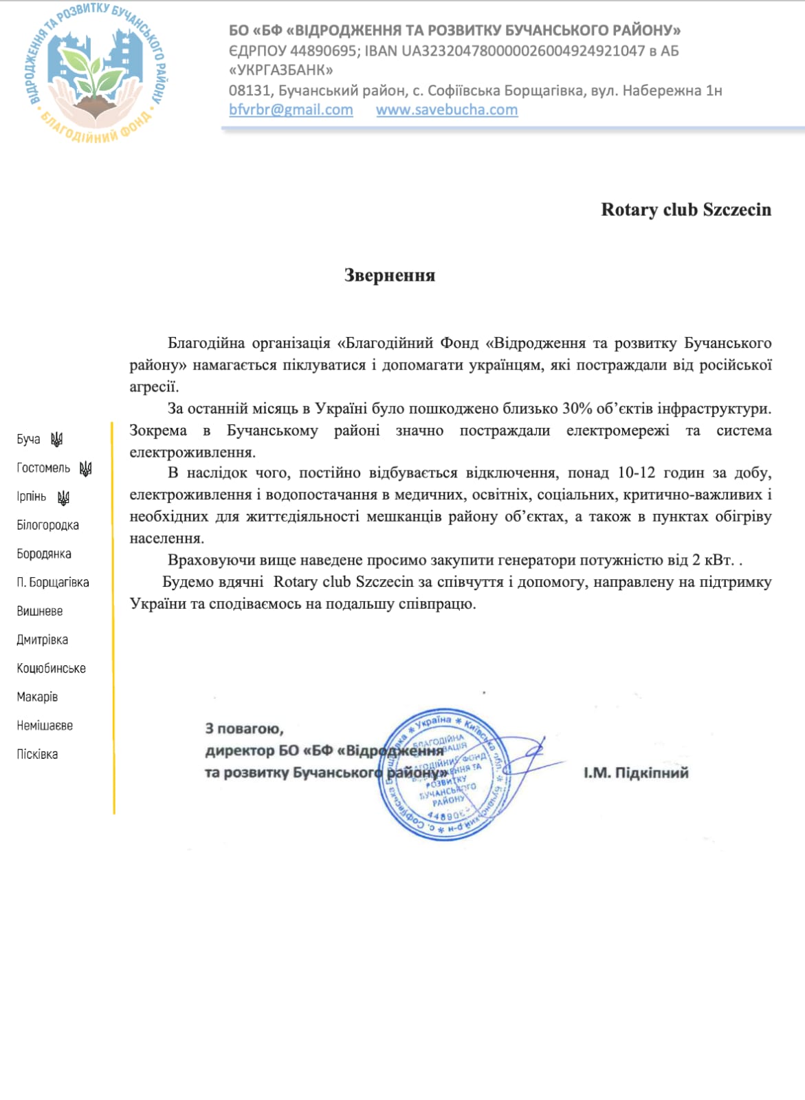 Aktualnie zajmujemy się dramatyczną prośbą z Buczy o dostarczenie agregatów prądotwórczych. Kupiliśmy już 3 agregaty za ponad 25 000 zł i zamówiliśmy następne 10 sztuk w Niemczech za ponad 24 000 EUR. Po 15 listopada dostarczone zostaną do Szczecina, a potem już naszym transportem pojadą do Buczy. Na realizację tej prośby nie byliśmy przygotowani finansowo, ale mamy nadzieję, że i tym razem wesprą nas rotarianie z innych klubów.