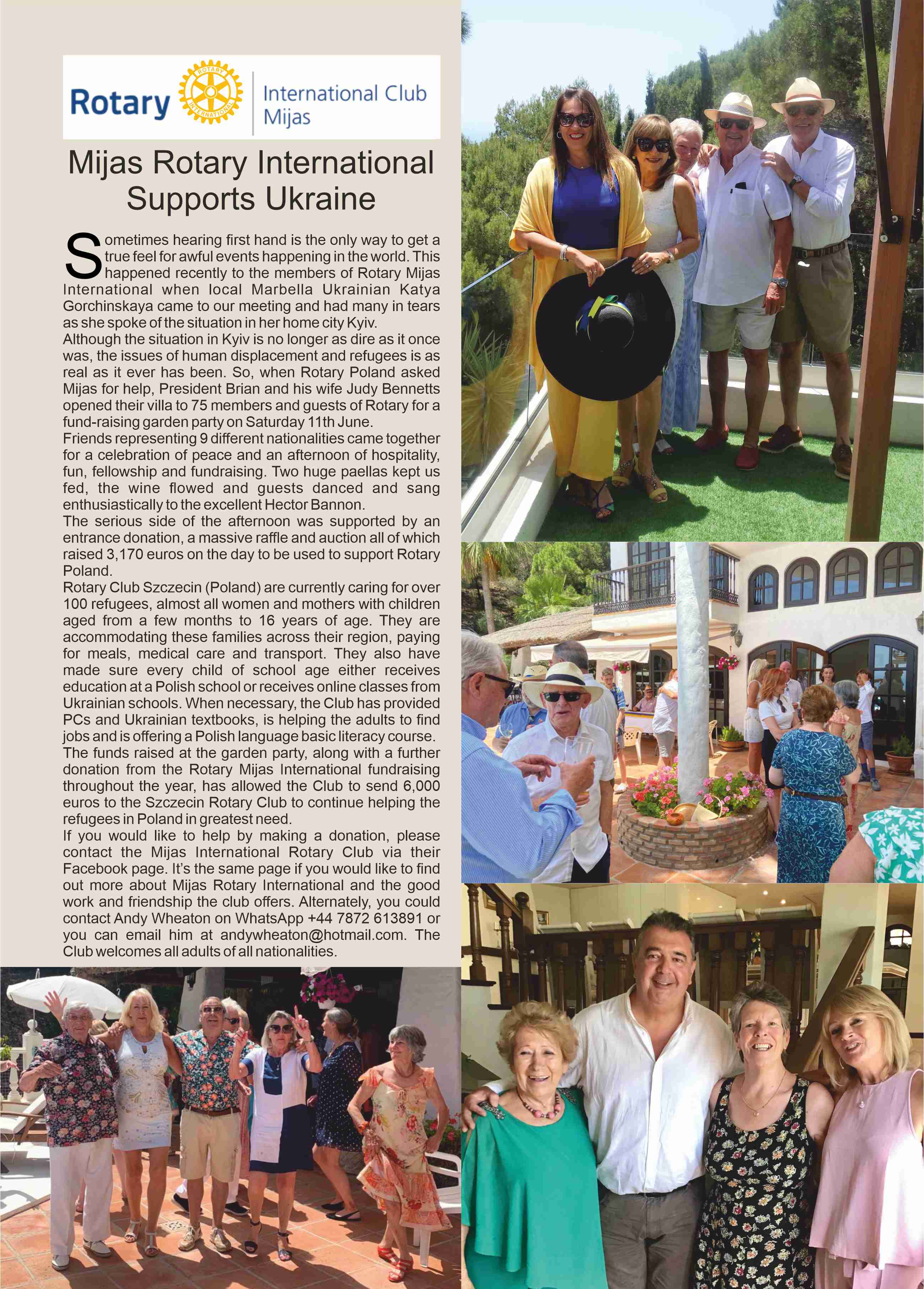 Jakiś czas temu nasz klubowy Kolega Wojciech Czyżewski PDG zainteresował kluby rotariańskie Hiszpanii i Portugalii pomocą jakiej Rotary Club Szczecin udziela gościom z Ukrainy. I oto na apel odpowiedział hiszpański Rotary International Club Mijas, przekazując 6.000 Euro na nasz projekt.