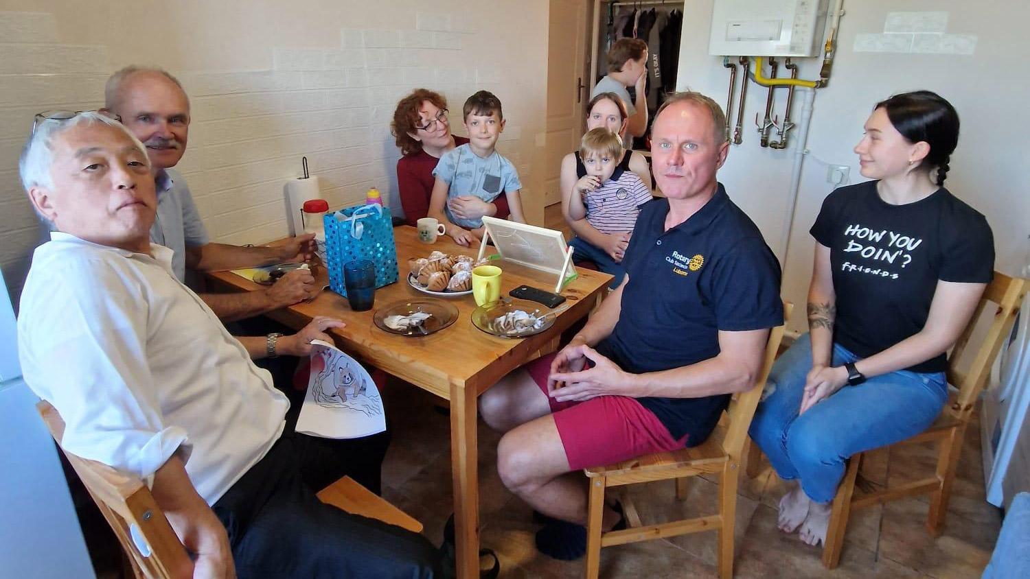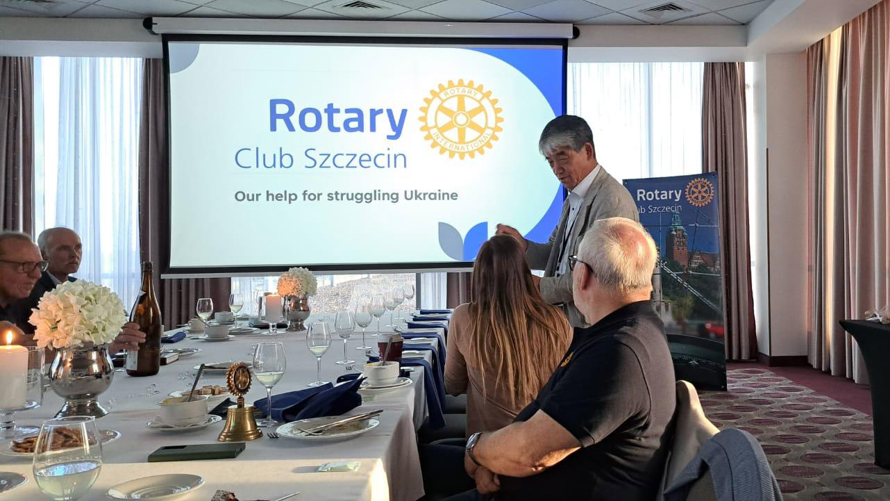Z Naoyuki poznaliśmy się ponad półtora roku temu. Tydzień po inwazji Rosji na Ukrainę Naoyuki nawiązał kontakt z naszym klubem i zaczął organizować w swoim dystrykcie zbiórki pieniędzy na pomoc uchodźcom z Ukrainy. Tak się zaczęła nasza współpraca. Tym razem przyjechał do Szczecina do naszego klubu. Razem z nim przyjechał też Masamitsu, rotarianin z Akity w Japonii. Przywieźli 2 wózki inwalidzkie i 5 wykrywaczy metali, które Masamitsu osobiście zwiózł do Kijowa. Podczas pobytu w Szczecinie spotkali się między innymi z będącymi pod naszą opieką uchodźcami z Ukrainy i z przedstawicielami stowarzyszenia Migracja. Wzięli również udział w naszym spotkaniu klubowym, na którym po wzajemnych prezentacjach poczęstowali nas specjałami przywiezionymi z Japonii.