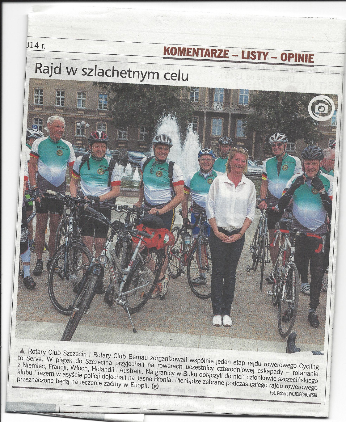 W dniach od 28.05. - 01.06 2014r. odbyła się organizowana w ramach klubowej współpracy RC Bernau i RC Szczecin, przy wsparciu klubów partnerskich z Niemiec i Francji, impreza rowerowa, której hasłem, ideą przewodnią, jest: "Jeździć na rowerze, aby pomóc! Jeździmy na rowerze aby potrzebującym tego ludziom umożliwić godne życie!". Impreza, objęta patronatem honorowym Prezydenta Miasta Szczecina, organizowana jest w ramach międzynarodowego projektu "Fellowship Cycling to Serve", wspieranego i promowanego przez Rotary International. Głównym celem charytatywnym tegorocznej imprezy będzie kolejny Eye Camp, czyli akcja leczenia zaćmy mieszkańców Etiopii.